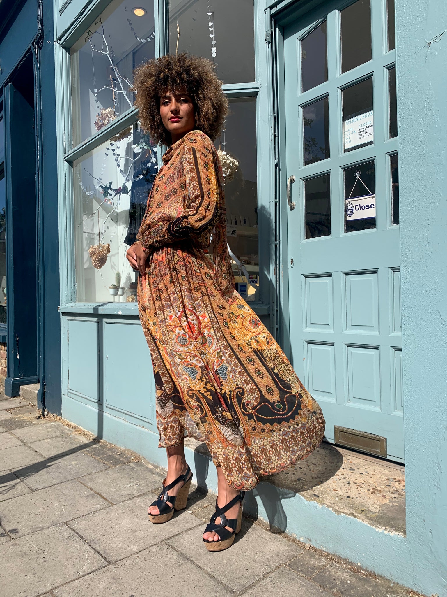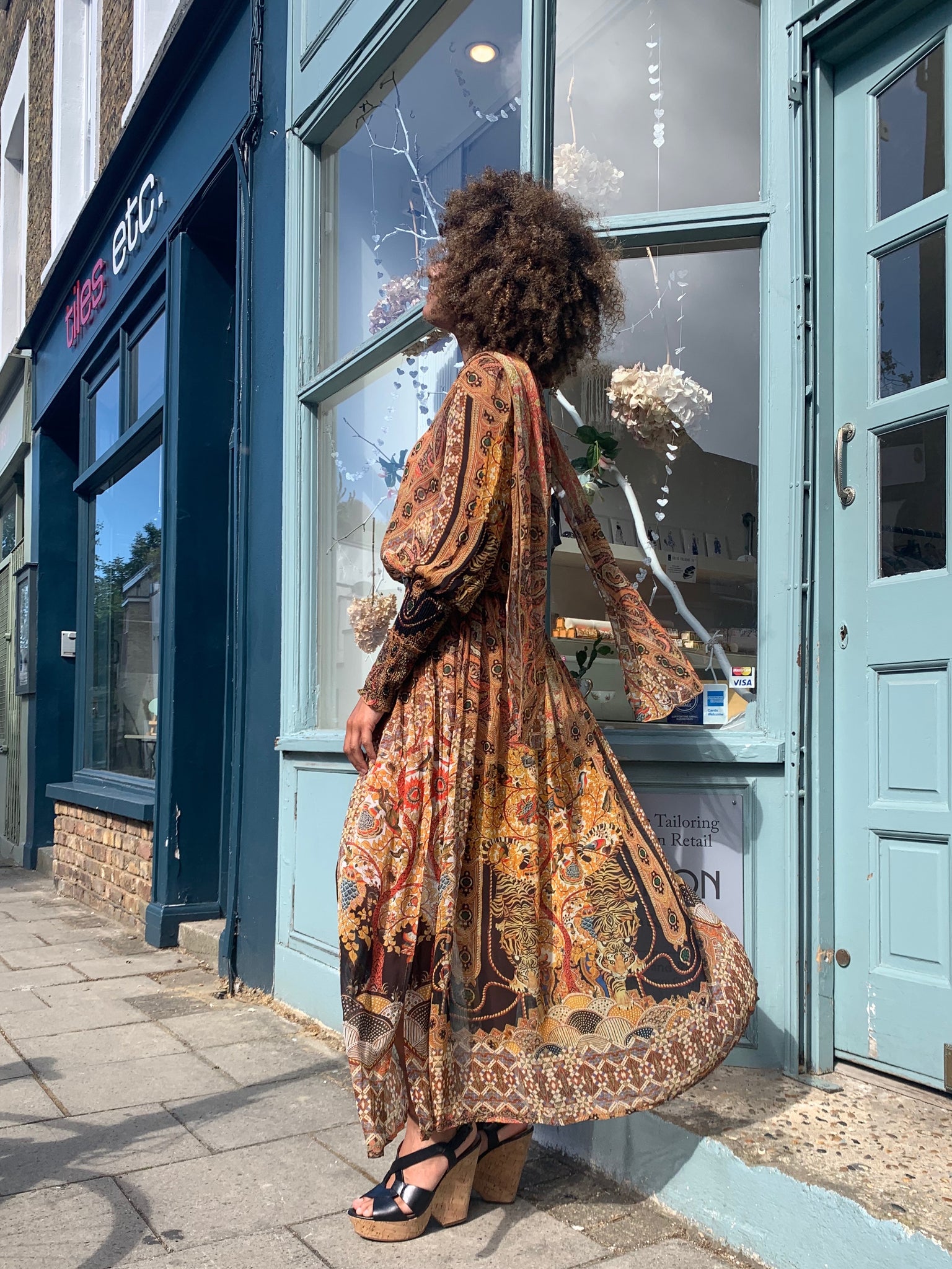 This vibrant jungle print maxi dress screams festival or country wedding, its vintage vibe is just perfect for the boho type. The elasticated waist and the blouse top have a generous allowance for multiple sizes. With the big tied bow, it looks chic and classy, a bit more rock'n roll undone like a scarf.