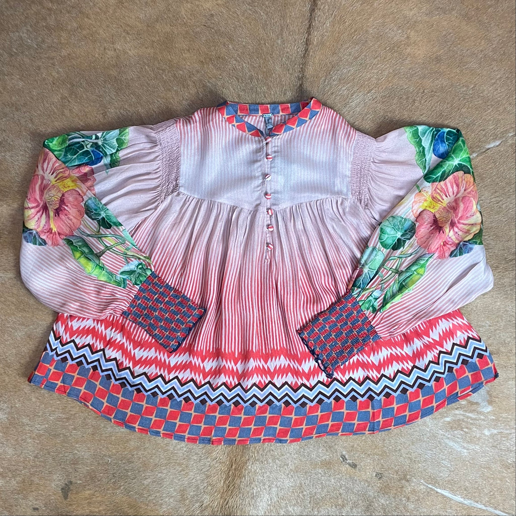 This pretty peasant style blouse is made from delicate chiffon fabric, has shirring details on top and wrists of the floral bell sleeves. The ombre print of stripes and geo patterns in striking red elevates this blouse way beyond "run of the mill" top. Team with blue jeans and a little heal and head out for drinks with the girls.