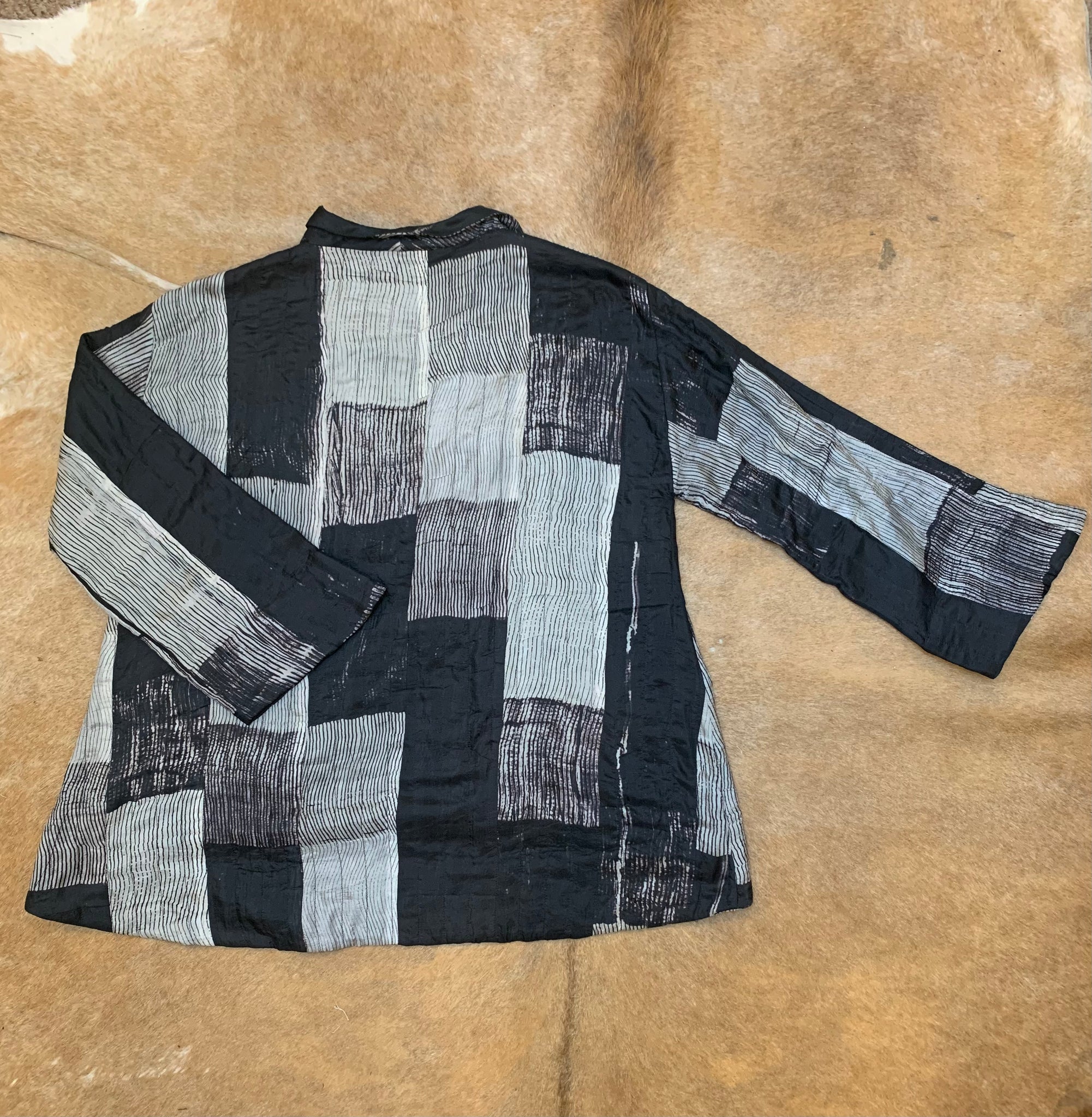 This simple one-button, soft blazer shape jacket lends the perfect silhouette and works hard for you at the office and at play. It has been shibori-dyed in artistic patterns of black and white, creating a timeless and elegant classic. The generous swing style cut is super flattering for the curvier shape, just cutting off below the bottom but is still figure-enhancing.