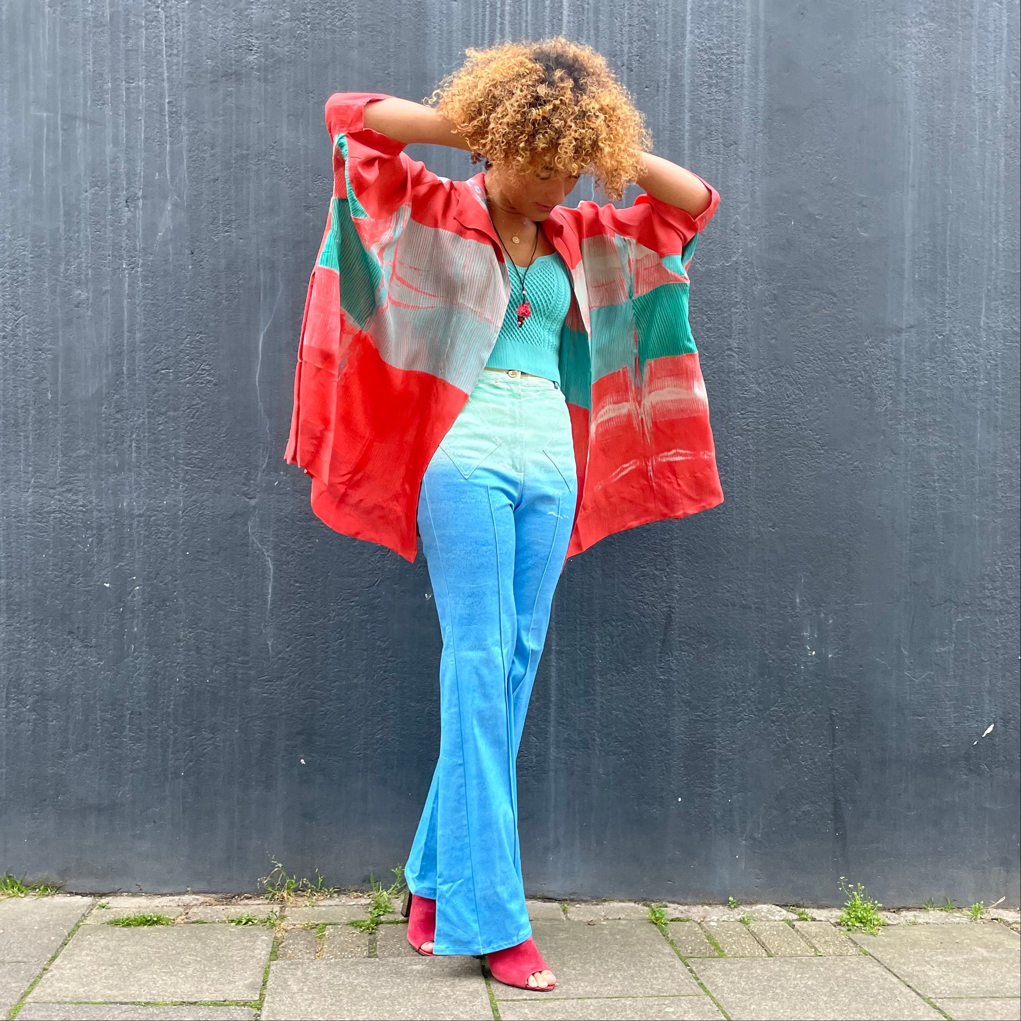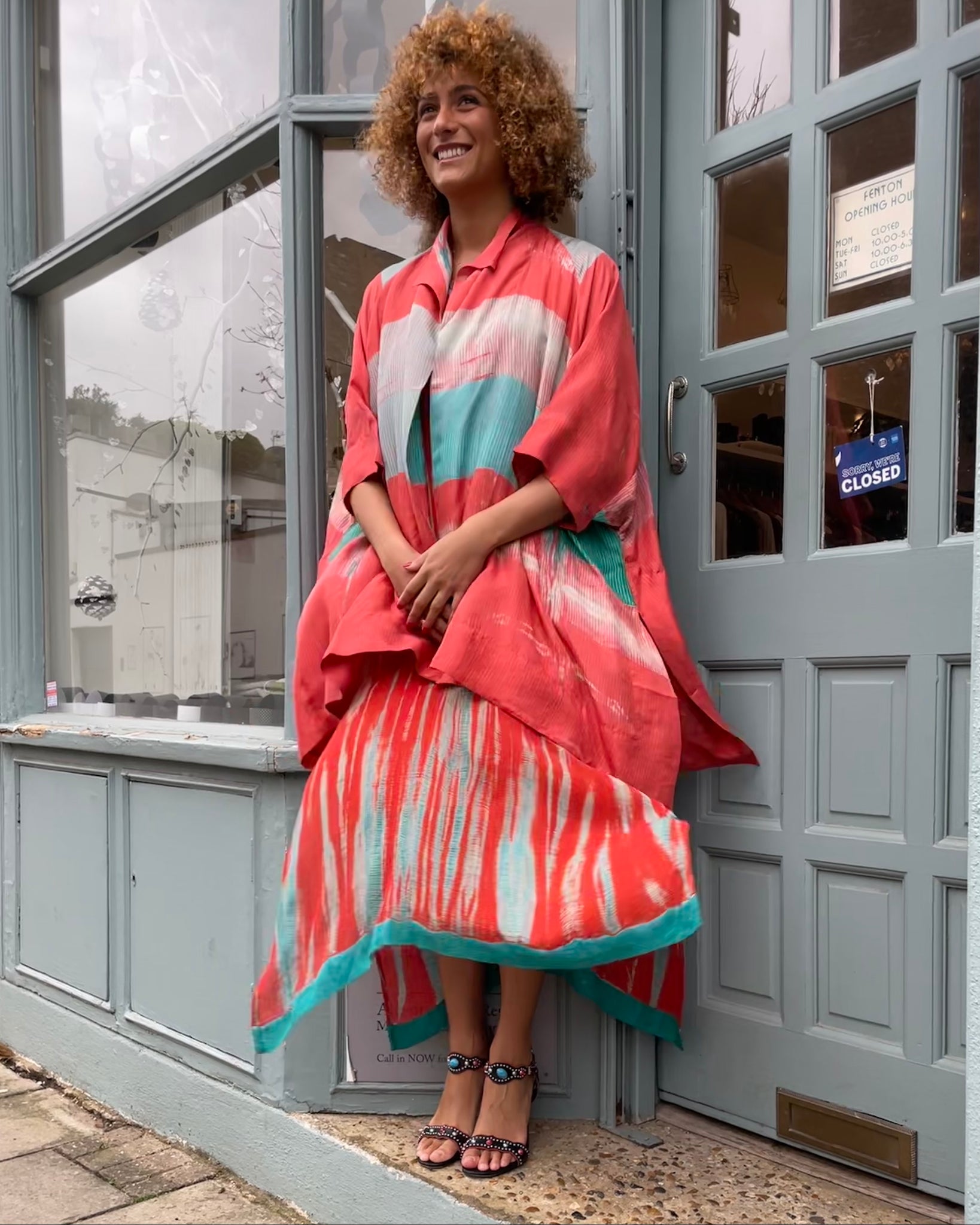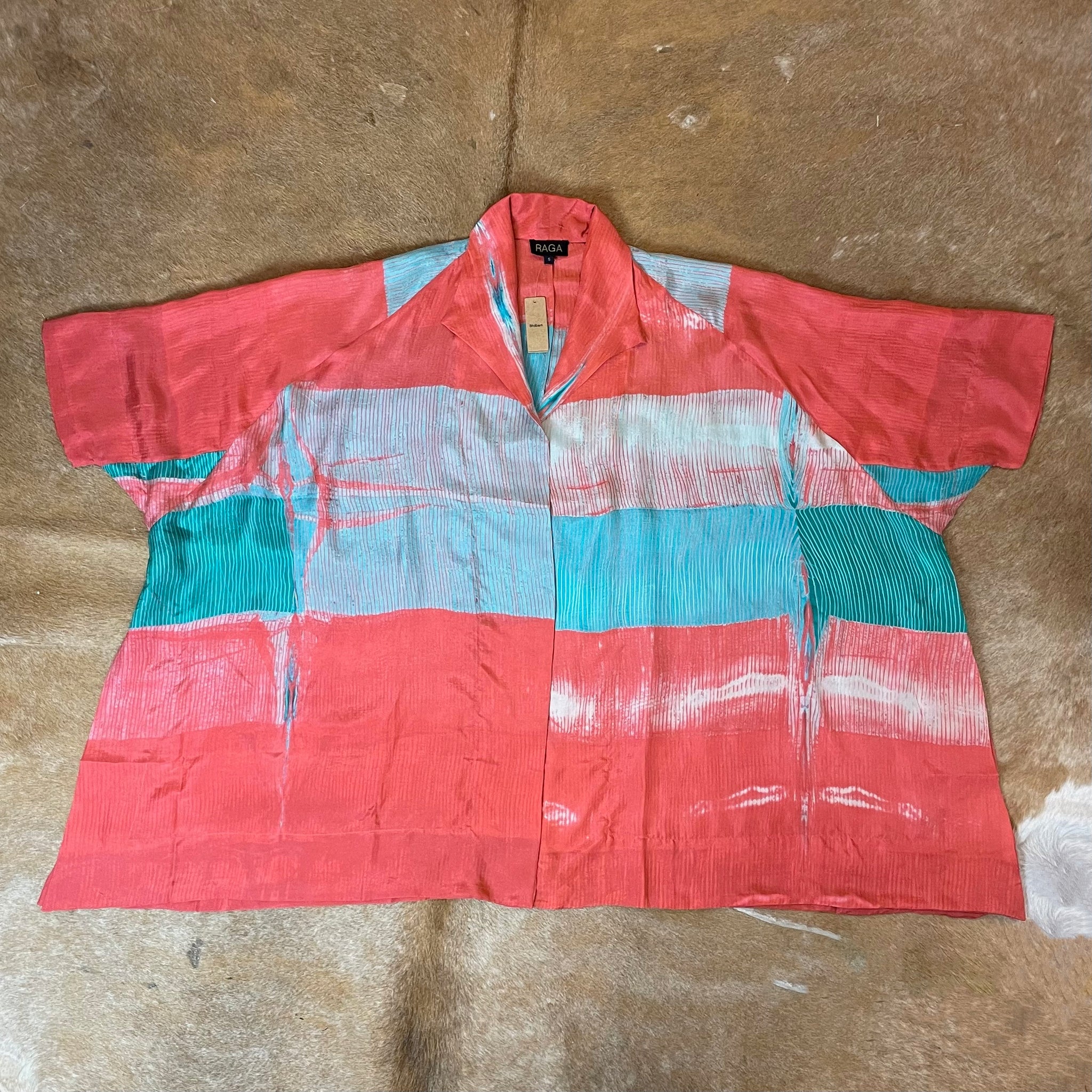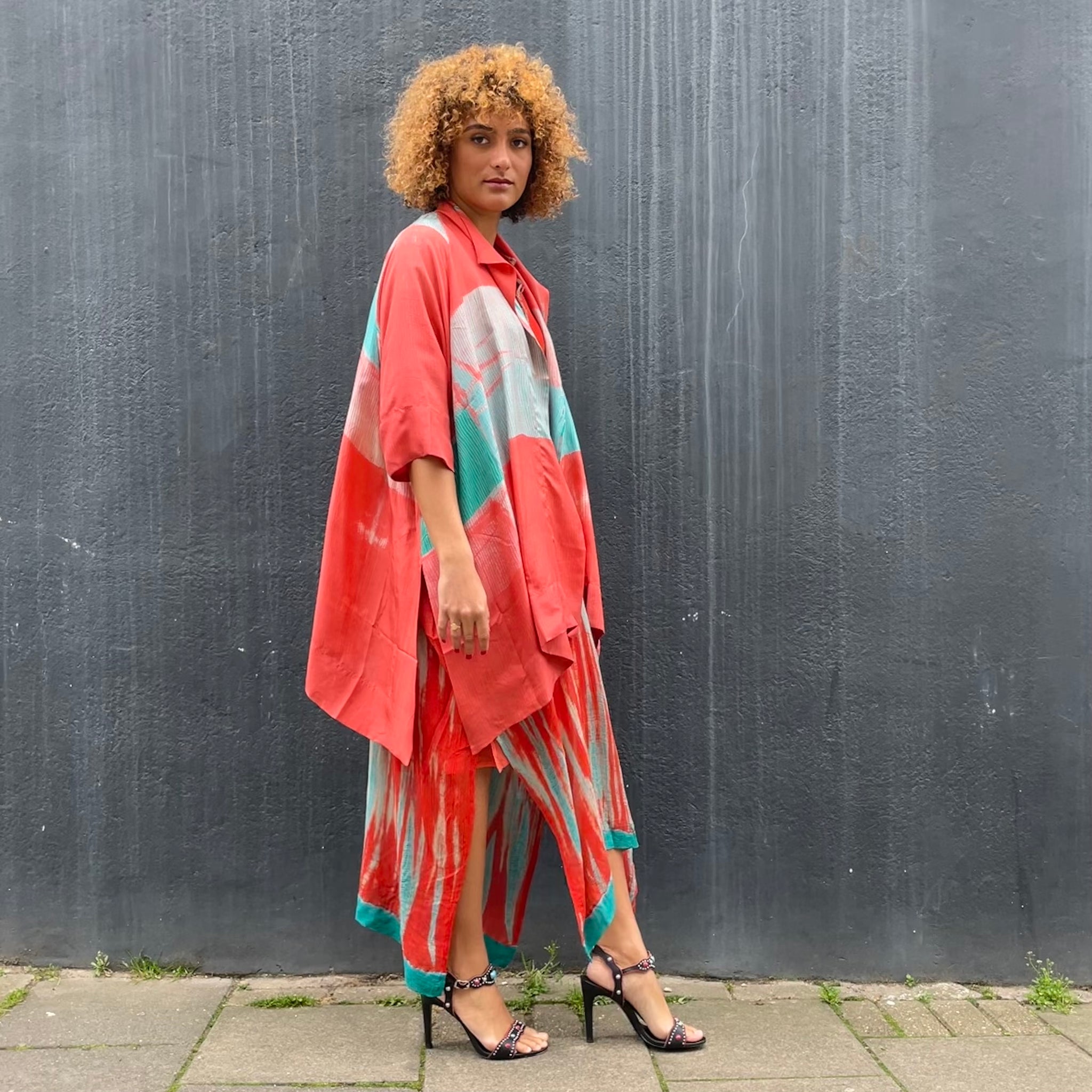 A stunning layer over a plain vest top this artfully dyed silk jacket enhances a casual outfit or adds a bit of drama to a simple dress. The oversized square shape creates a relaxed silhouette but maintains a distinct luxurious look whether dressed up or down. This super light jacket is the perfect summer throw-over.