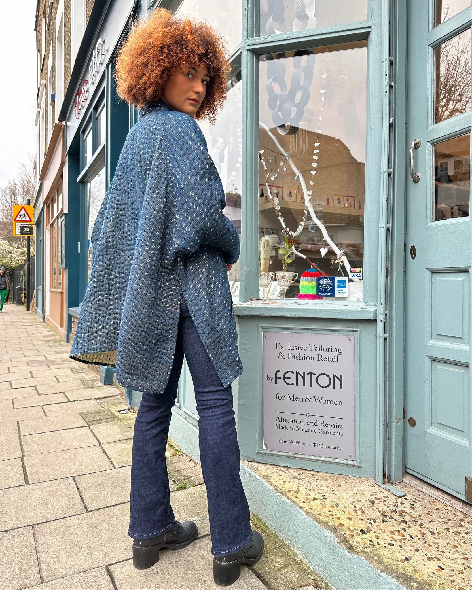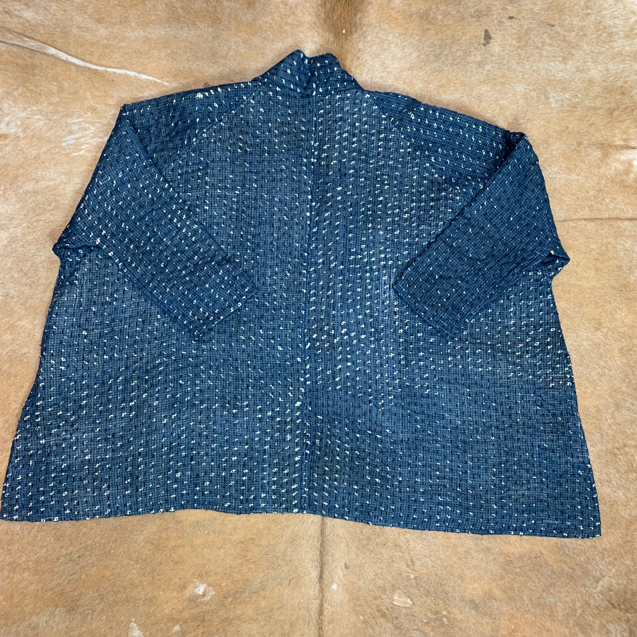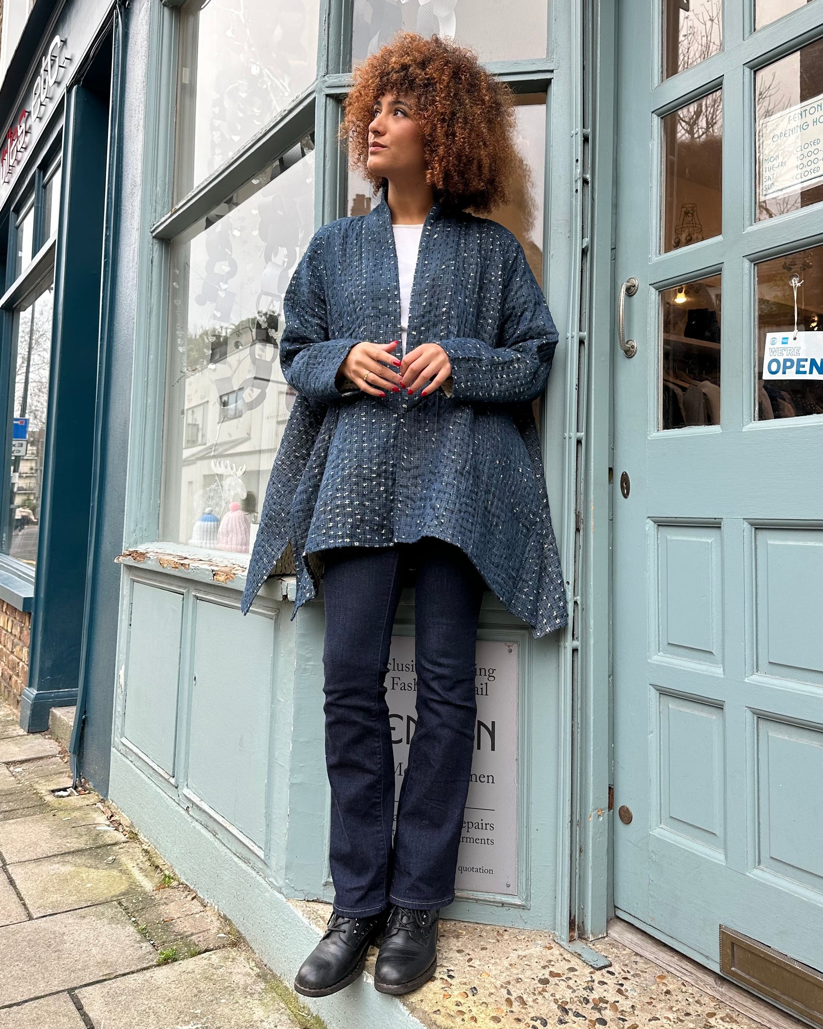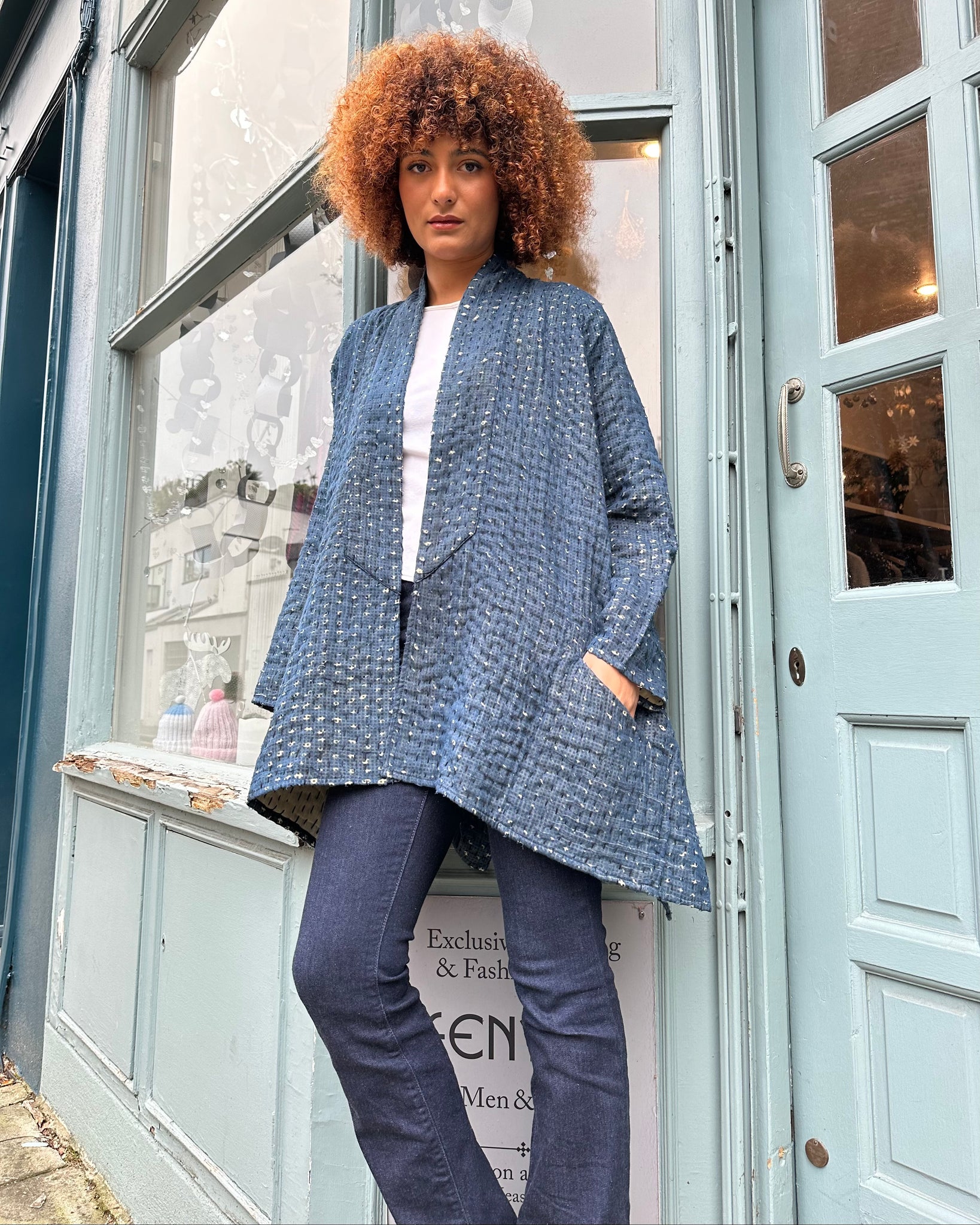 Lightly quilted indigo cotton jacket with Kantha stitching, this gorgeous oversized jacket is a real stunner and an excellent mid-season coat, allowing plenty of room for extra layers.