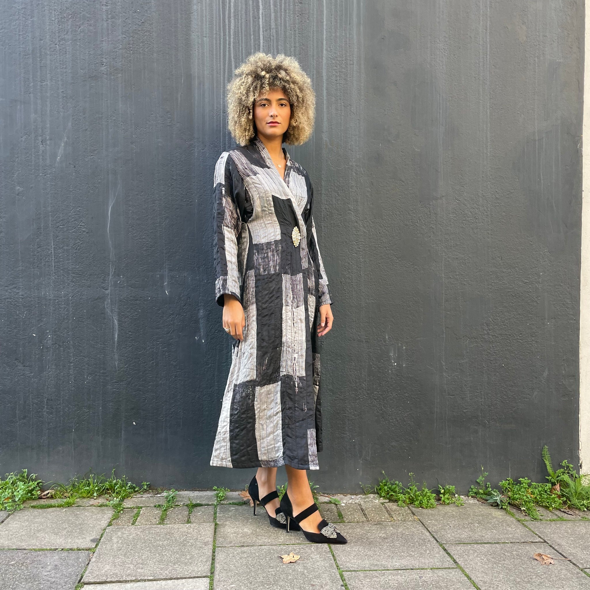 Slip into this gorgeous robe and let your fierce sense of individuality shine. This lightweight, floor-length silk coat is a subtle A-line shape, has pockets and is decorated with an artfully crafted graphic shibori pattern. Thrown over anything simple in black or white, or add a brooch and wear it as a dress. You will easily capture some admiring looks whilst looking graceful and stylish.